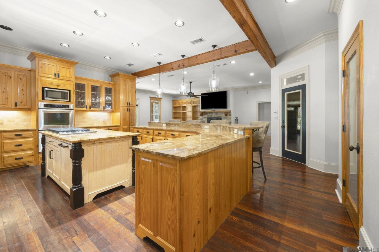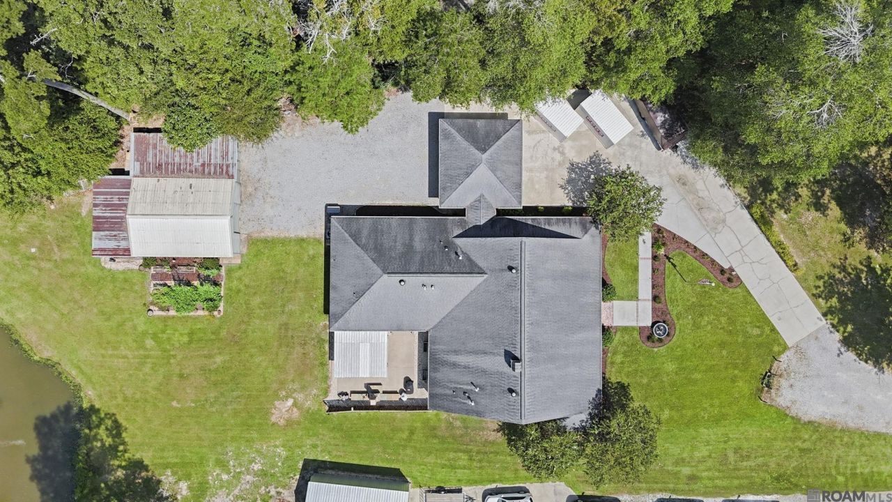 Beautiful, custom built 3 bedroom, 3 bath home with an office that sits on just over one & a quarter acre lot. Open floor plan that is perfect for entertaining. 9 foot ceilings and wood floors throughout living areas. Kitchen features granite countertops, custom built cypress cabinets, walk-in pantry, large island, gas stove, double ovens, stainless steel appliances, and a wine fridge. One of the biggest primary bedrooms you'll see with a en-suite with dual vanities, separate shower, and soaking tub. You can enjoy owning a piece of LSU history with the wood floors in the 2 additional bedrooms being reclaimed wood from the original Alex Box stadium! Flooring was added to the attic and there is additional storage space above the carport. Enjoy outdoor living with an inviting wrap around porch in the front of the house and a screened porch in the back. Feel right at home on the outdoor patio with its fireplace, pergola and a wonderful view of the pond. Along with the home having a whole house generator, there is also a detached 20x30 shop with electricity plus additional enclosed storage areas. Home did NOT flood.
